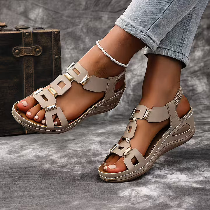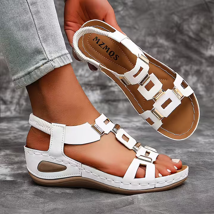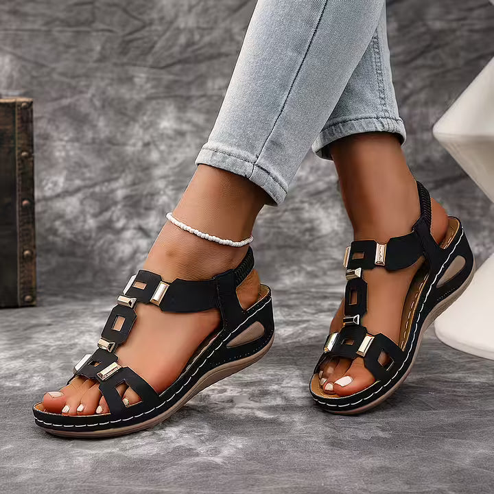These open toe sandals feature a structured multi-strap upper accented with metallic details for a bold finish. The slingback construction and supportive sole create a balanced silhouette suited for daily wear, travel, and warm-weather styling.