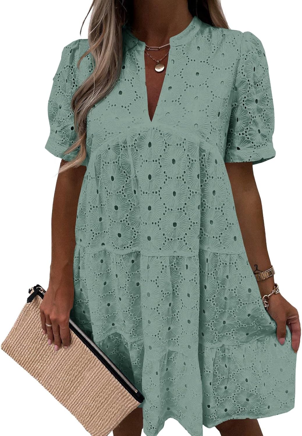 Imily Bela Womens Lace Eyelet Casual V Neck Tunic Dress